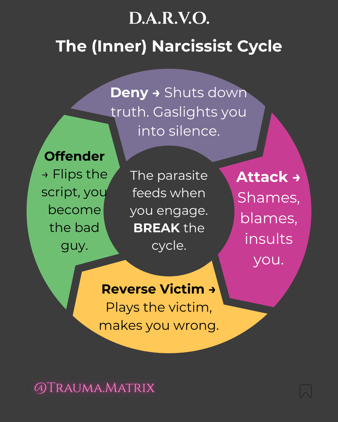 This isn’t just about the narcissist in your life, or operating in colonial narcissistic systems. The same tactics—Deny, Attack, Reverse Victim & Offender—can live in your own mind, quietly keeping you stuck. Your inner critic is relentless, convincing you that you’re the problem, that you made the wrong choice, that you deserve the shame. It’s DARVO turned inward.